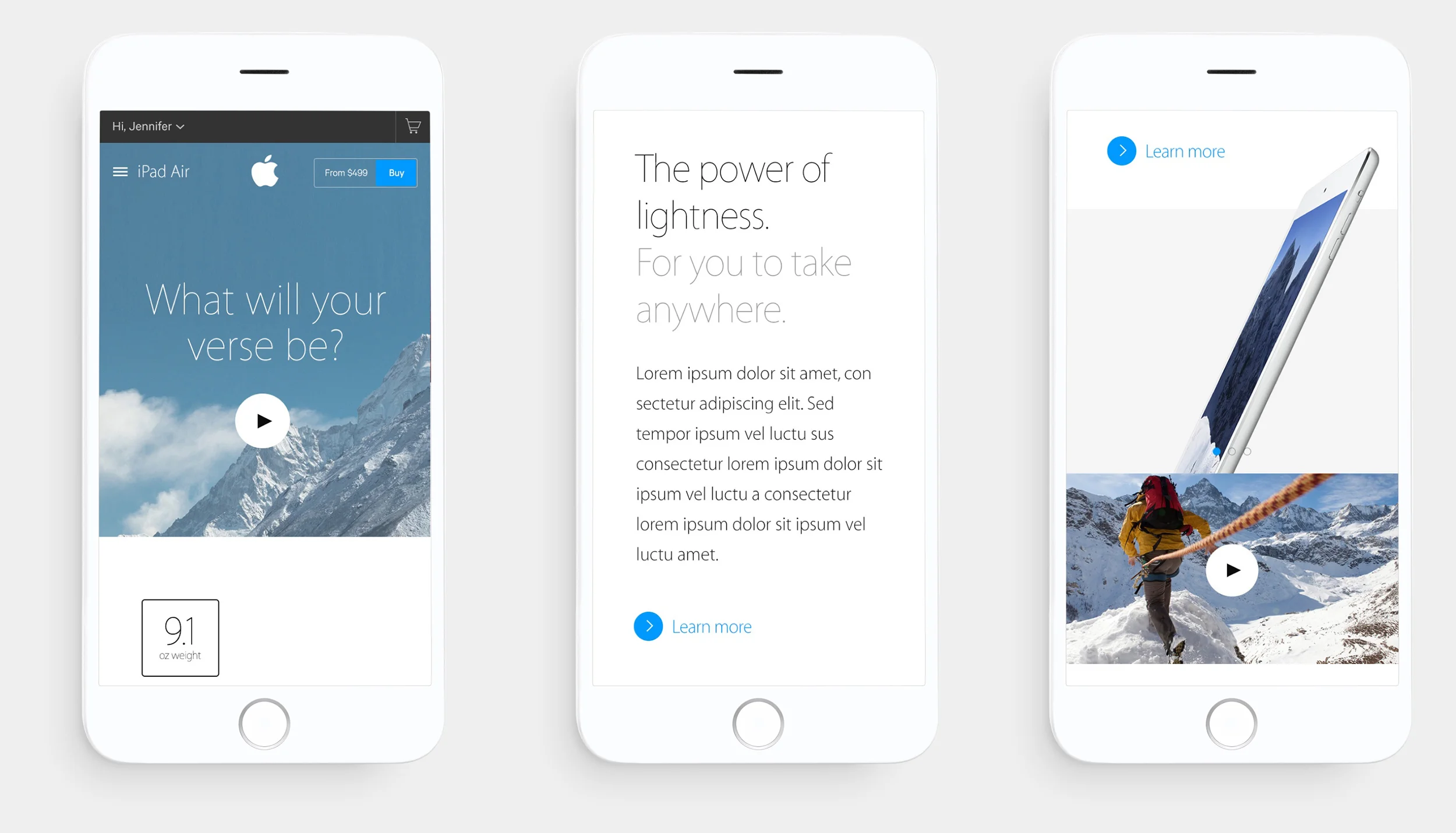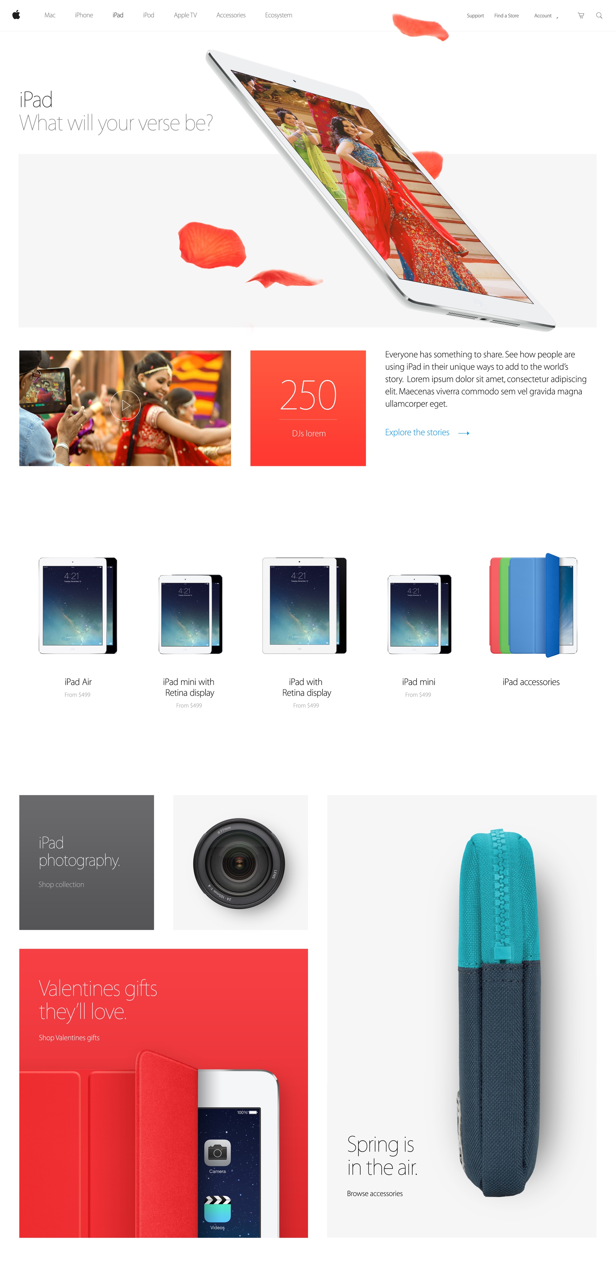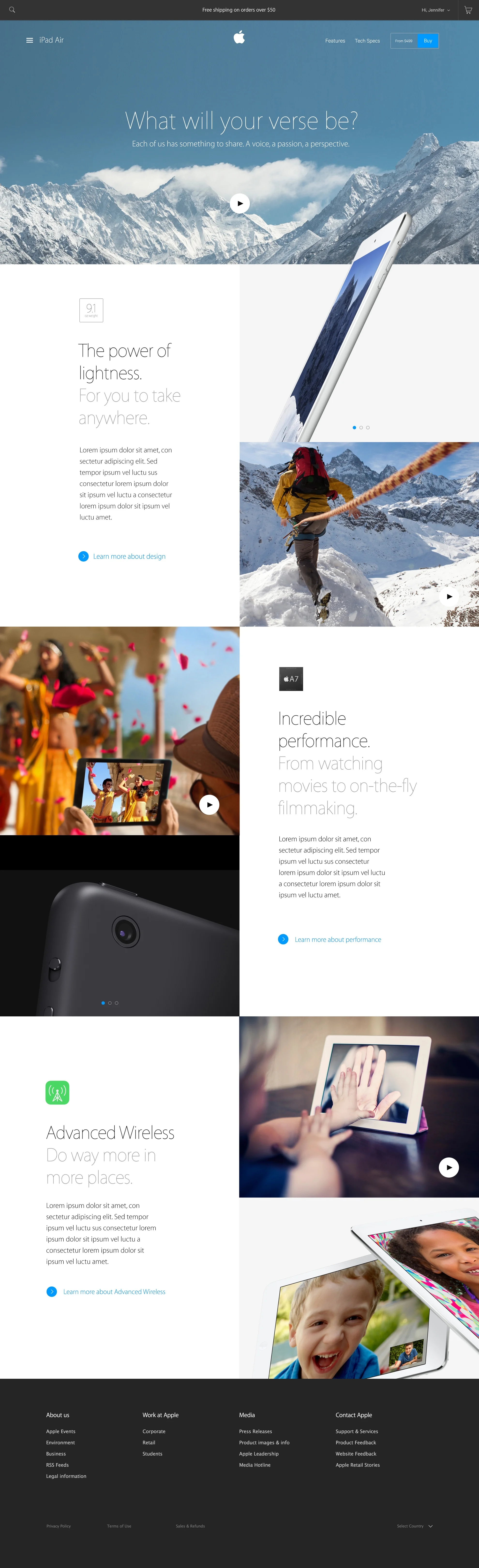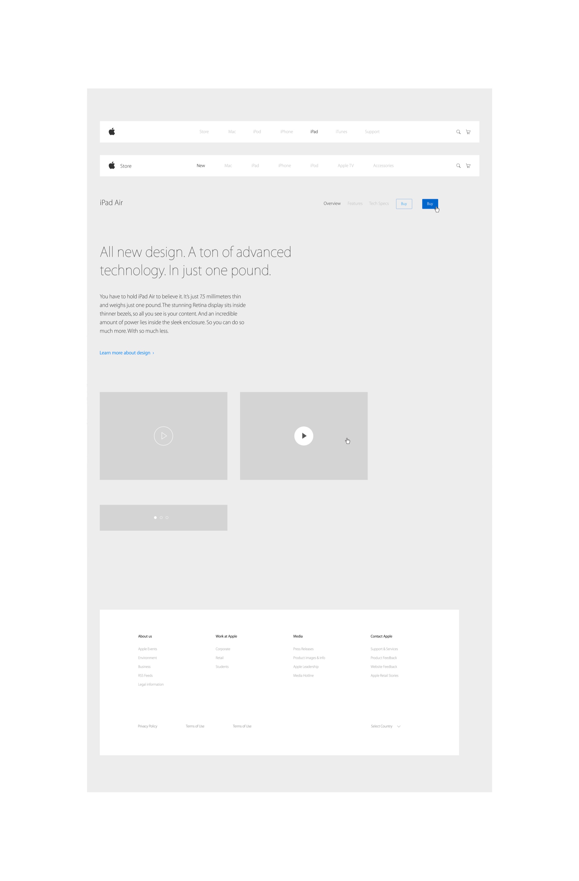 We explored many ways of integrating campaign content (ads, video testimonials, etc.) into the more evergreen product detail pages (iPad, Mac Book, etc.).