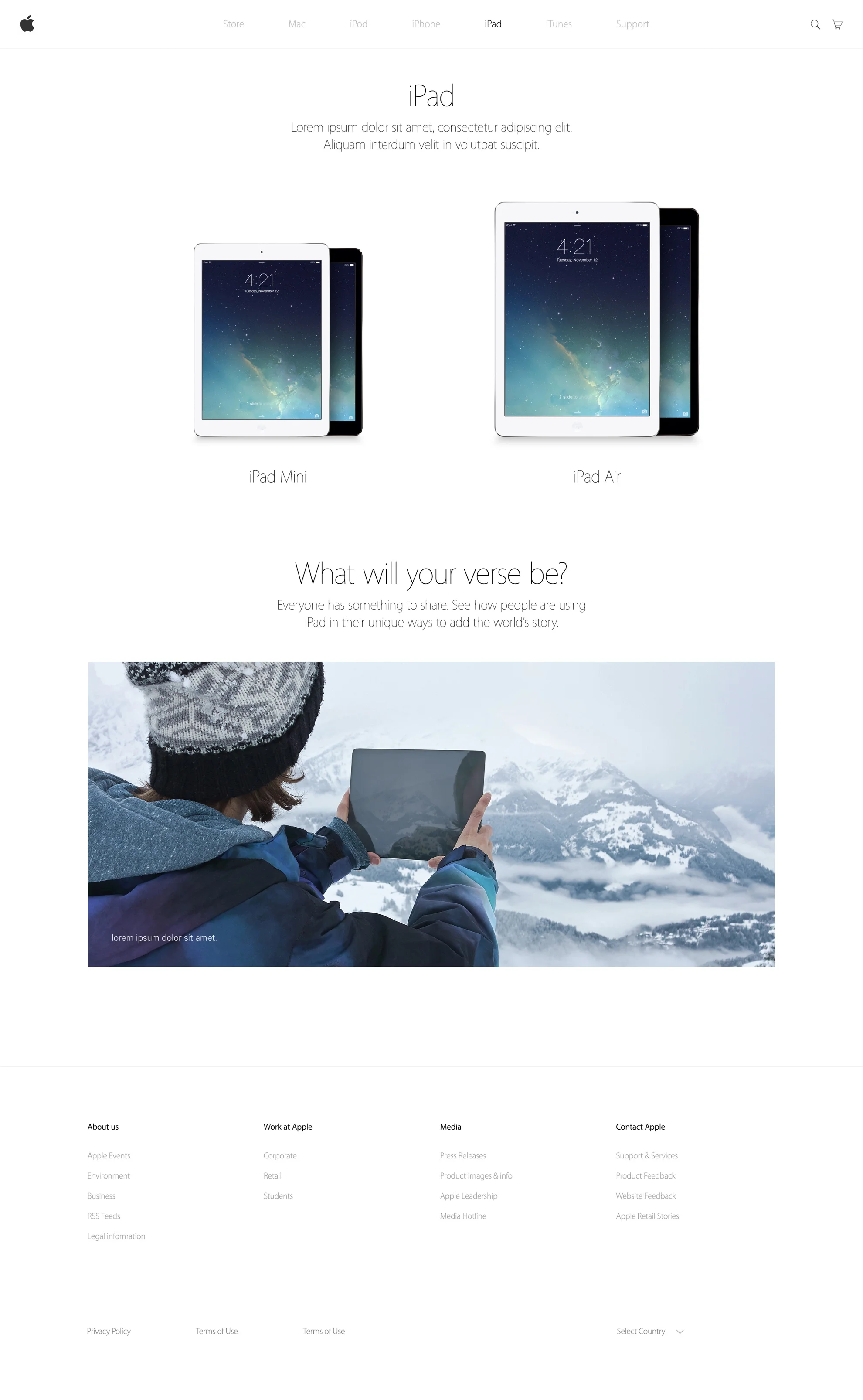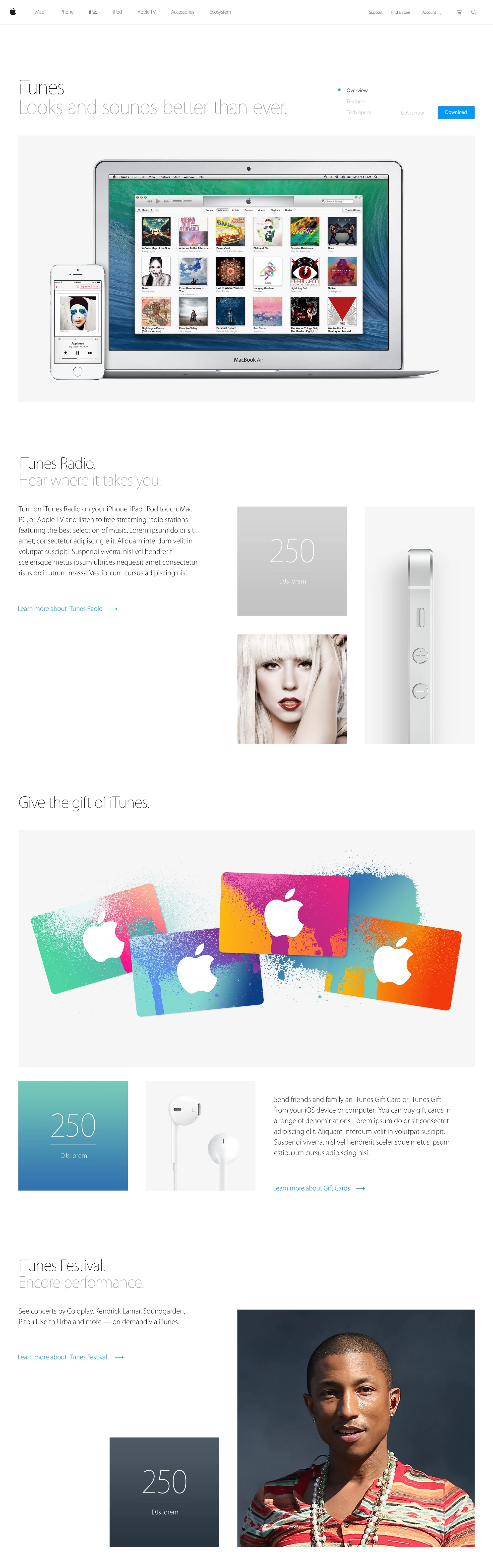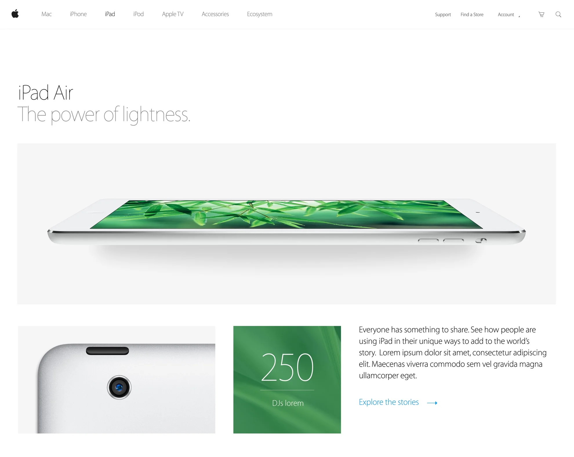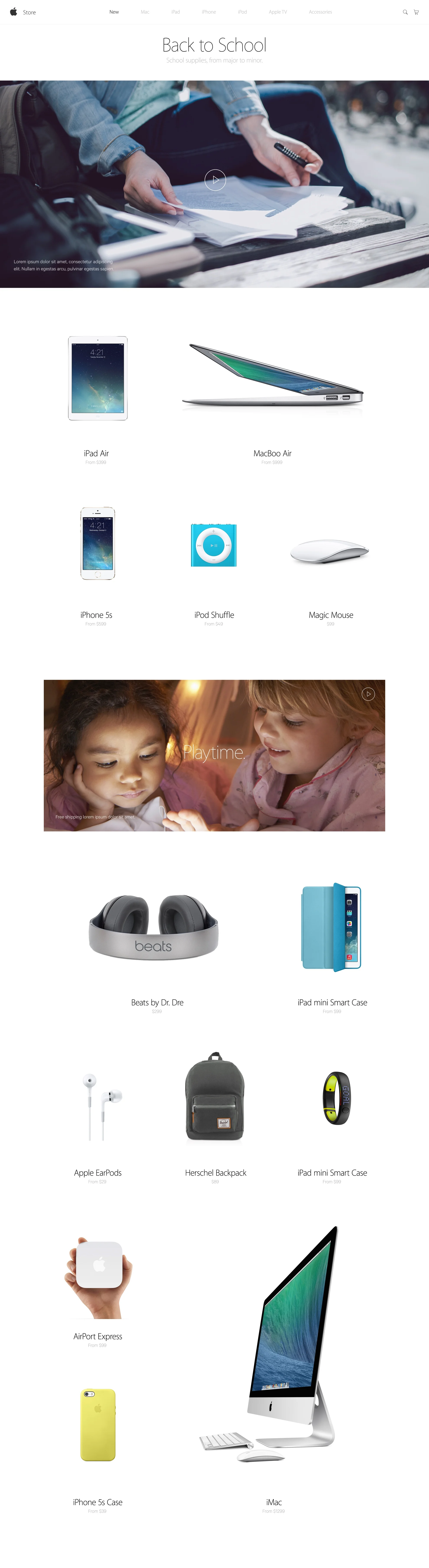We explored many ways of integrating campaign content (ads, video testimonials, etc.) into the more evergreen product detail pages (iPad, Mac Book, etc.).